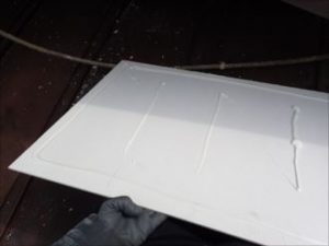 ケイカル板での補修工事をしました。ケイカル板は簡単にカット作業が出て削ることも可能です。今回は無塗装品により工事していますので、貼り付け終了後には表面保護のため塗装を施します、化粧ベニヤとは違い、圧縮材ですので表面からボロボロと剥がれる心配が無く耐候性も優れているため、今までのような心配をすることが無く生活できます。
