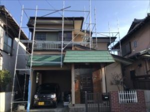 軒天の腐植はありますが、場所により大きく破損したり全く問題がない場所と色々です。お客様宅の特に北面は劣化している場所が多く、玄関が北側なので特に悪い部分が正面になってしまいます。低予算で悪くなっている場所を部分補修として今回は修理いたします。軒天の工事では必ず仮設足場を設置しなくてはいけなくなりますが、今回は部分的な工事なので、仮設足場も最低限倒れなく補修工事が出来る範囲のみの足場となりました。長期的な工事ではないので、部分仮設足場工事になります。仮設足場を家全体に掛けるとかなりの金額になり見積書にもかなりのウエイトが掛かってくるため、今回は安全に工事が出来る必要最低限にて留めています。