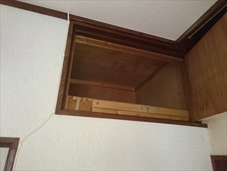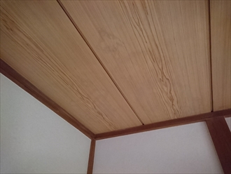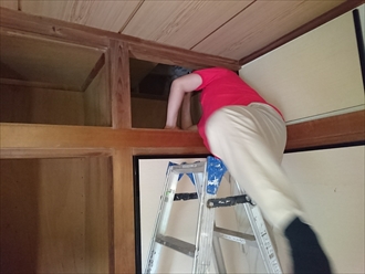 雨漏りしているのは和室の天井部分です。敷目天井という木目の材料ですが、雨漏りの染みがくっきりと出ています。小屋裏の状態を見てみたいのですが、和室の場合押し入れの上に天袋という収納スペースがあるので、その部分の天井板が外れる様になっています。ここが点検口になっているので、ここから入って天井裏の状態を見てみます。