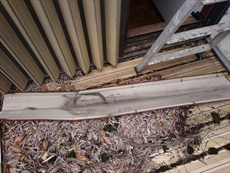 バルコニーには金属の板が剥がれ落ちています。これは棟板金(むねばんきん)といって、上の画像の様に屋根面と屋根面の継ぎ目を隠す様に屋根に被さっている金属の板です。しかし、雨漏りしている部分は、その棟板金がどこにもなく屋根の継ぎ目が剥き出しになっていました。本来は、屋根材の上に貫板(ぬきいた)という木を打ち付けて下地にして、その上に棟板金を被せてから釘で固定するのですが、こちらの建物には貫板も無くなっていました。この状態を見る限り、空き家になっていて気付かなかったけれど、相当前から棟板金が無くなっていた事が想定できます。早急に直さなければ雨漏りの被害が拡大して、建物の構造材まで傷みが出てしまう事になります。