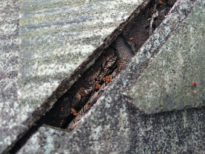 斜めの部分の真上です。ここは隅棟(すみむね)といって屋根面と屋根面が斜めにぶつかった部分なのですが、屋根材の下の防水紙が切れていて、下地の野地板も丸見えになっています。これでは雨漏りするのは当たり前です。