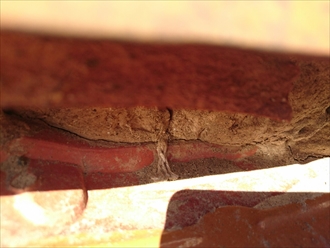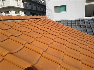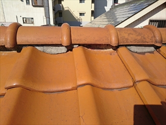 屋根は瓦葺きで、全体的には状態はそれ程酷くなさそうです。瓦屋根のどこにこの様な白い欠片を使われているのか見てみます。瓦屋根は、屋根面と屋根面がぶつかった部分に『棟』と呼ぶ瓦を積みます。接点からの雨水の浸入を防ぐ役割があるので、重要な部分です。