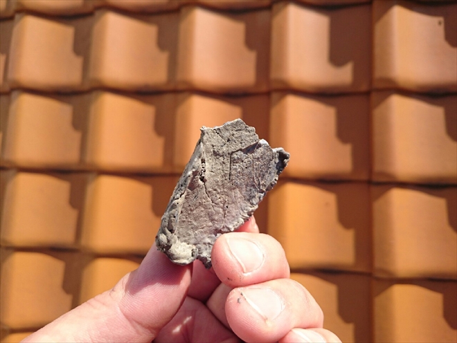 横浜市西区でお問合せのあったお客様です。庭の掃除をしていたら、白い欠片が落ちているのを発見したので、何かと思ってお問合せをいただきました。屋根は瓦葺きで、棟瓦部分にはしっくいが詰めてあるのですが、白い欠片はこのしっくいが剥がれ落ちた物でした。瓦屋根のしっくいの役割は、簡単に言えば防水です。棟瓦の下地になっている土が雨によって削られない様に、土の外側に漆喰を詰めていきます。この漆喰が剥がれてしまうと、雨が降るたびに少しずつ土が削られてしまうと、段々と棟瓦の支えが無くなってしまい、棟瓦が崩れる原因になっていきます。今回は小さな欠片を見つけた事で、屋根の被害を未然に防ぐ事が出来ました。屋根は普段見えにくい部分ですので、ちょっとした変化に気付いた時には直ぐに対処して直していきましょう。