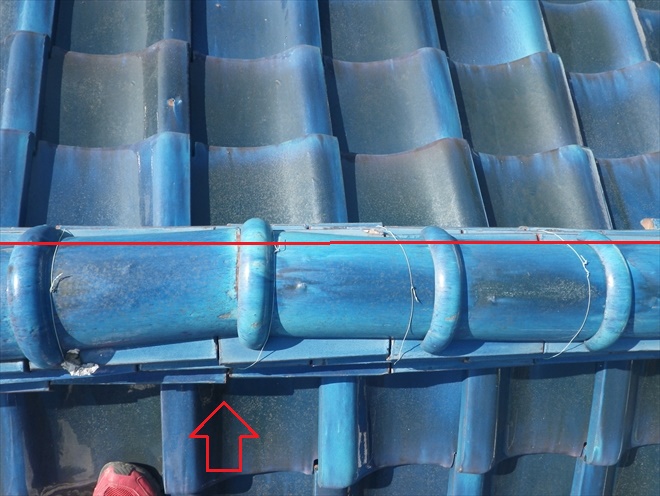 漆喰は剥がれて土が削れてしまうと棟が崩れ始めてしまいます。矢印部分は棟が崩れ始めて外側に広がってきています。赤い線は、本来はこの線に沿って真っすぐ瓦が固定されていなければなりませんが、蛇行する様にズレてきています。川崎市高津区の瓦葺きの屋根は、強風の影響を受ける前に軽い金属屋根への葺き替え工事をお薦めします。