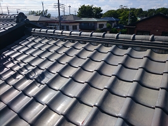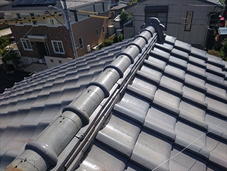 川崎市高津区で屋根の調査をおこないました。屋根に何かの欠けらが落ちているので見て欲しいというお問合せです。瓦葺きの屋根で屋根の上に落ちているのは、ほぼ間違いなく『漆喰(しっくい)』です。日本瓦は波型の断面なので上に平らな棟まわりの瓦を乗せると隙間が出来ますので、その隙間を埋める為に漆喰を塗ります。また、棟瓦の土台に使われている土が削られない様にする役目も持っています。漆喰が剥がれると土が剥き出しになって雨が降る度に削られてしまい、いずれ棟の支えが無くなって崩れてしまいます。という事で早速屋根の状況を確認してみましょう。