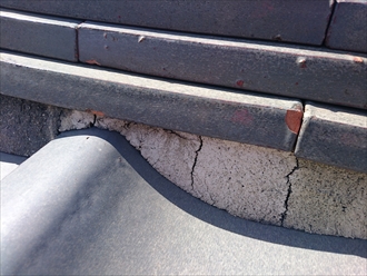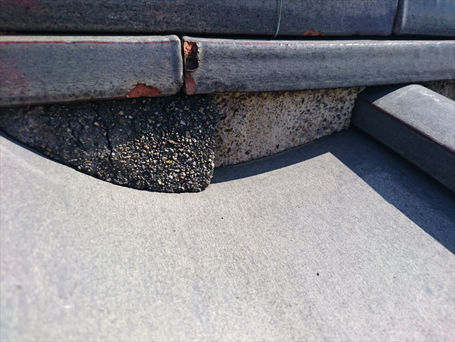 ここが漆喰が剥がれた部分なのですが、よく見ると、棟の下地が土ではなくモルタルで作られています。モルタルの上に漆喰を塗っている様です。