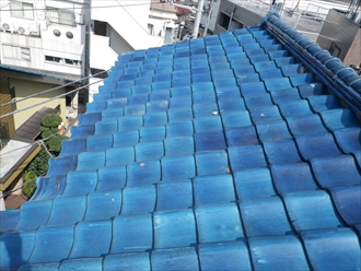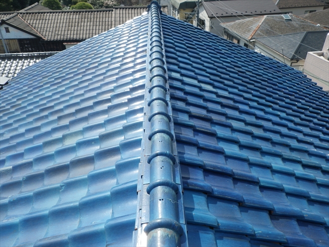 川崎市高津区で屋根の調査をおこないました。近所の方から瓦がズレている様だとご指摘があったそうで、調査に伺いました。屋根の瓦の状態は桟瓦という平らな部分は問題なさそうですが、よく見ると棟部分がズレているのが分かります。漆喰が剥がれている所が結構あり、この漆喰の剥がれが棟が崩れかかった原因になっていました。棟瓦は土を土台として積み上げられていて、その土を保護する為に塗ってあるのが漆喰なんです。漆喰が剥がれると土が剥き出しになってしまい、雨が降ると土が削られて下からの支えが無くなってしまい崩れてしまいます。建物の直ぐ横は歩道になっているので、瓦が落ちてしまったら大変です。完全に崩れてしまう前に、早く直しましょう。