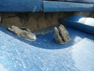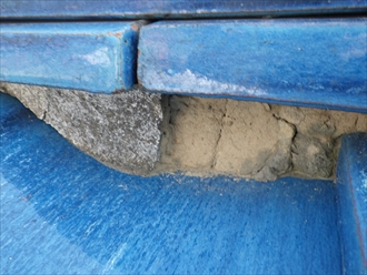 泥が削得ているのが分かりますか?ここまで行くと、棟瓦を一度どけて下地を作り直して棟を積み直す、取り直し工事をしなければなりません。