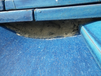 泥が削れて棟が崩れたり、雨水がどんどん瓦の裏側に回って、雨漏りの原因になっていきますので、早急に修理工事が必要です。雨漏りする前に直して安心してお住まいになれるお手伝いをさせて頂きます。