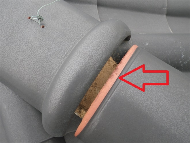 本来であれば、矢印部分の溝に上の瓦が納まる造りになっているのですが、3~4センチも下にズレてしまっています。左に見える針金状のものは、サビて緑青が出ている銅線です。通常ですと、瓦の中には芯木(しんぎ)という木が通っていてそこから銅線を伸ばして棟瓦を固定しますが、こちらは芯木が通っていない様です。
