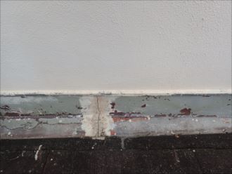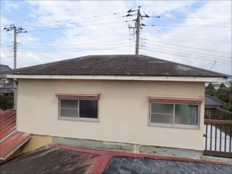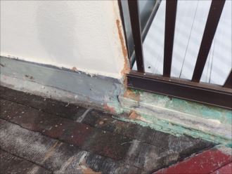 雨漏れが発生した場所は、だいぶ前に増築した住宅でした。丁度家と家をつなぎ合わせていた所ではありますが、左右の屋根に受けた雨水が一同に集まってしまう場所でもありました。今まで2階の屋根面に受けた雨水は、雨樋で真ん中の屋根には誰落ちなかったのですが、台風の影響により飛散してしまった結果、左右の雨水が一気に流れ込んでしまったと考えられます。調査で見てみると大きなヒビ割れ(クラック)が雨の流れる場所にあり、今まで以上に集まった雨水がヒビ割れ(クラック)を通り室内に流れ込んできたものです。