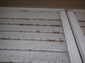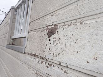 一部分の外壁なども劣化がありました、表面塗料が剥がれサイディング事態に水分が含まれ脆くなって来てます。本体が柔らかくなると釘などが抜けやすくなり、破損につながったり、反りが出て来るので、塗装をして保護しましょう。雨戸などの薄い鉄部分は錆びると薄い為に穴が開きやすく補修が出来なくなってしまいます。何にせよ早目のメンテナンスが必要です。