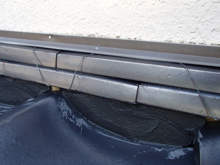 漆喰詰め直し工事では、まず古い漆喰を除去します(左写真)。これは古い漆喰の上から新しい漆喰を塗っても、見た目は綺麗になりますが短期間で剥がれてしまったりして長持ちしないからです。