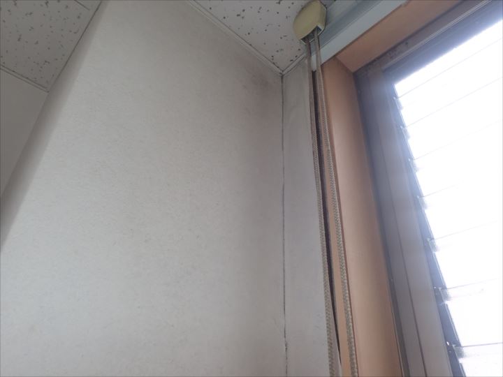 天井部分から壁に伝わり雨漏れが室内に影響を出しています。クロス内側より雨漏れが発生しています。クロスは表面にビニール製が施されているため、剥がれたり染みが生じないと雨漏れが生じた事に気がつかず、長い間放置されることが多く、修理するころには工事工程が大きくなる事があります。少しでも変化を感じたら早目の点検を心がけした方が、宜しいかと思います。
