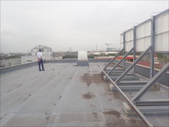 屋上に上がり調査すると、屋根面がビルとも在り陸屋根にシート防水が設置されていました。耐用年数に比べると見た目上では劣化が進んでいる様に思われます。屋根の形状は陸屋根と言い、勾配が薄く雨水がはけにくい形でしたので所々に雨だまりが出来ている状態でした。