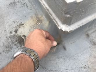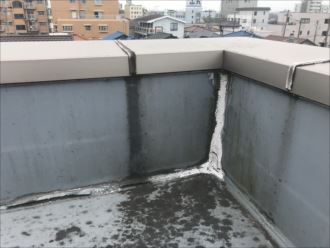 シート防水の耐候年数は12~13年です。丁度耐候年数になる所ですが、シートの浮きや切れ・ヒビが多く確認できます。コンクリート構造ですので、少々の切れでは室内に雨漏れが生じにくい物ですが、室内に影響が出てきている事を考えると、耐用年数が来る前から少量の雨漏れが生じていたという事です。シートは年数が経つと劣化が進み縮んで来てしまい、溶着部分(繋ぎ目)が切れる状況が多くありますが、お客様の自社ビルも壁が立体になってシート防水のシート加工された場所が劣化現象で切れやヒビが多く入っていました。
