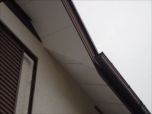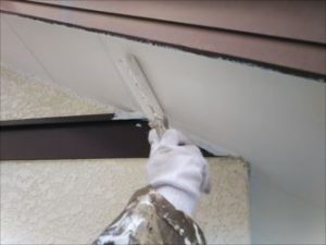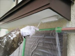 高圧洗浄の工程を経ていよいよ外壁塗装が始まりました、まずは高い位置にある軒裏塗装から始めます。
