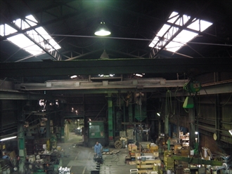工場は、アルミか何かの鋳造工場のようで、屋根には大きな換気用の煙突がいくつかあり、見上げると、屋根や煙突廻りからいくつか光がさしています。