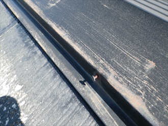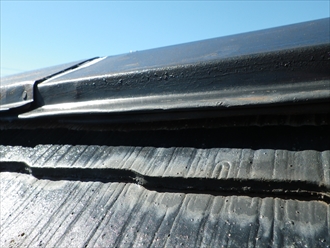 棟板金が浮いています。下地の貫板に水が回って傷んでいました。そのせいで釘が抜け掛かっていますので、放っておくと風で煽られて飛んで行ってしまいます。