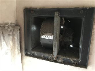 お客様のお宅のトイレは増築したらしく、換気扇のすぐそばに雨樋があり、コーキングの施工ができていなく、隙間がありました。雨が強く降ると吹き込んでしまうのも無理ありません。換気扇の老朽化もあり、お客様のご要望では「換気扇は撤去して雨漏れがないようにしてほしい」とのことでした。換気扇はしばらく使っておらず、なくても不自由しないそうです。ご要望に応じて換気扇を撤去いたします。