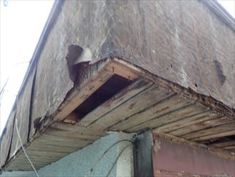 屋根自体は瓦棒のトタン屋根でした。勾配がほとんどありません。こう言った状況の屋根にはパラペットなどが設置してある場合が、多く見られます。近隣との立地条件下で光効率などの規制がある場合で、屋根の高さが取れない場合などにもよく見かけます。腕壁などとも言われています。特に屋根勾配がほぼ取れない状況では、水はけや雪の落下防止などに役に立つ事があります。屋根勾配が取れないと、屋根つま先などの防水処理に困ってしまうわけですが、立ち上がり(パラペット)を作ることにより防水紙などの立ち上がり箇所の確保などの役割も有ります。