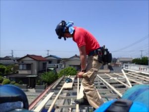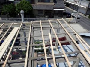 ベランダの日除けは木製により手作りにより施工設置されていましたが、長年の年月により劣化してしまっていました。釘穴から浸入した雨により、木製根太垂木が腐食していたため、今回の工事で新しい木材へ交換いたします。手作りとは思えないくらい基本に忠実に作られていたため、修復工事はとてもしやすく、作業が円滑に進みます。
