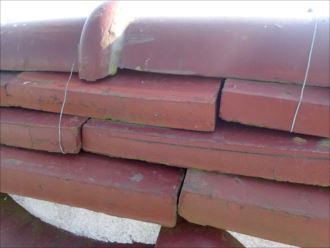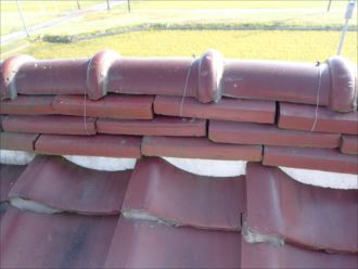最後に根源を探しに屋根にのぼり、確認いたします。小屋裏で雨漏れ個所の確認をしていたのでおおよそは解っていましたが、最終確認で明らかに棟が崩れかかっていることを視認しました。重ねてある棟瓦が内側にずれてしまい、雨水が室内に誘導している状態でした。この様な状態になっていると、雨漏れはとめることができません、棟の取り直しが必要になってしまいます。棟は屋根土と漆喰により形成されています。古くなってしまえば取り直しをして作り直さなくてはいけません。棟は大風や地震などで崩れたりずれたりもしますので、災害時の後には点検をお勧めいたします。