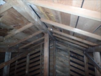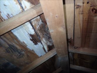 二階の押し入れに小屋裏を点検できる通気口があり、中に入ることが出来ました。雨漏れがある場所には資材の劣化や痕跡が必ずあります、ごくまれに不明なこともありますが、ほとんどは木材を変色させるため、痕跡を残すことの方が多く、目視で見分けることが可能です。天井のシミ跡付近の棟の場所には大きく劣化した場所がありました。