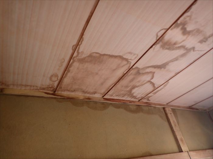 木更津市のお客様は数年前から雨漏れがしていたのは分かっていたらしいのですが、天井から床に垂れてくることはなく、「古い住宅だからと」なかば諦めていたそうです。近頃の長雨や連続で来た台風により、驚くほど雨漏れが酷くお悩みになっていました。ネットで弊社のホームページを見て、ご連絡をくださいました。