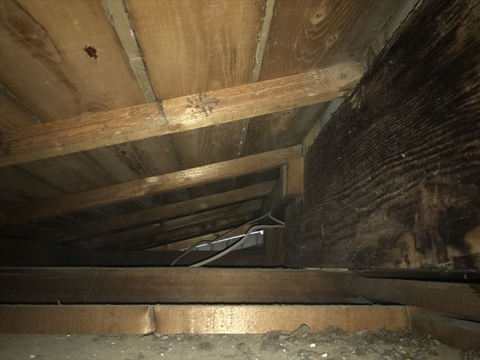 点検口を天井に設置し、天井内を見ると、梁り部分に雨漏れ箇所を発見いたしました。予想通り、後付けバルコニーの設置箇所です。後付けの場合、防水工事の後に固定用の釘やビスを打ち込みますので、防水をすることが困難になってしまうこともあるのです。散水調査では自然の雨の何十倍の水量を流しますので、小さい隙間などの特定には最適です。