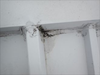 屋根自体の劣化が進行しており、さまざまな部分に錆がでています。コーキングが切れ、再度補修工事をしてもそう長くは持ちません。定期的に雨漏れが生じ、その度に補修をしたそうですが、コーキングを盛りすぎて雨水が浸入しても逃げ道となる場所まで塞いでいます。逆に雨漏れがの原因を作っているようなものです。屋根全体に同じような補修がされており、雨漏れの原因となる場所が多数確認できました。