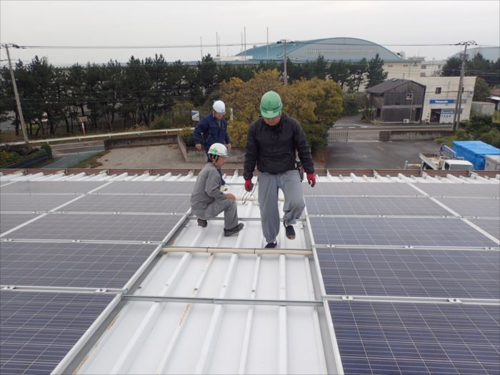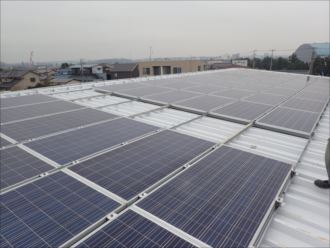 屋根には一面、ソーラーシステムを組まれており、修理するためには脱着をしなくてはいけません。後付けでパネルをのせると、金属屋根にボルトを数多く開けるため雨漏れの原因にもなります。パネル自体は屋根の代わりになりますが、真上からのボルト締めですので、パッキンの劣化とともに雨水の浸入があるというデメリットもあります。