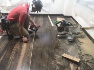 工事を終わらすことよりも、その後の仕上げ作業が大変です、床材(MDF)を電動工具などを用意て切断すると、細かな粉状の粉末になってしまいます。通常のほうきなどでは取り除くのは難しく掃除機などを多用して綺麗に清掃いたします。どうしても機械などでは限界があり、最後はやはり人間の力が必要です。傷のチェックやボンド等の後など全てチェックいたします。なるべくお客様の生活リズムを崩さないように限られた時間にきりが良く工事を終了できるように、工事時間を考えながら工事を進めて行きます。