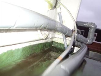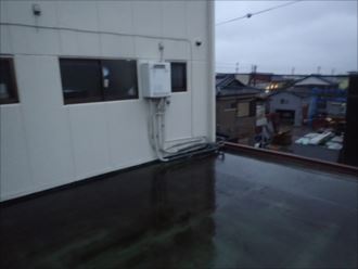 屋根からとお話を聞き、屋上に当たる場所に上り調査を開始してみました。屋根の形状は陸屋根(平らな屋根)になっていました。屋根と言っても、防水方法が違い平らな面にウレタン防水をされています、言ってみれば大きなバルコニーのようもので、屋根の構造とは違い、ある程度なら雨水をためることも出来ます。