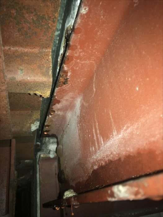 建物形状は鉄骨コンクリートの建物です。室内には事務所と言うこともあり、天井には点検口がありました。天井内部を見ることが可能で、点検口を開けてみると丁度鉄骨に雨だれがありました。明らかに外部からの侵入です。