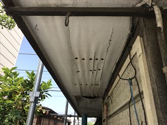 一番良い完全に治すのであれば、軒天を撤去して破風部分からすべて治します。軒天下地や軒天を新たな商品に作り直します。工事期間は撤去から始まり全て作り直しますので約2週間以上はかかるでしょう。工事期間と伴い予算もかかりますが、この先長い間メンテナンスが掛からなくて済むでしょう。
