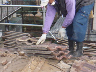 杉並区のH様邸にてジンカリウム鋼板のエコグラーニへの屋根葺き替え工事がはじまり、汚れやコケの発生が目立ち、表面の塗装が剥がれてしまっているセメント瓦の撤去作業を行いました。