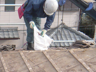 一般的な瓦屋根の場合、その重さは約6t、運搬用トラックの荷台は撤去した瓦でいっぱいになります。