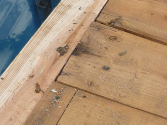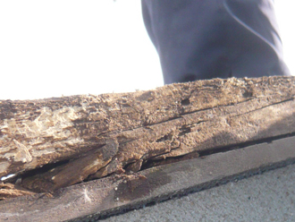 ■左写真:補修前のケラバ部分の腐食した下地木材 ■右写真:補修したケラバ部下地木材