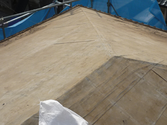 重たかった瓦はすっかり降ろされ、この後、防水シートを敷いていき、その上に新しい屋根材、重力が軽く、地震に強いエコグラーニを葺いていきます。