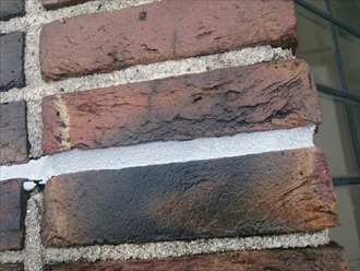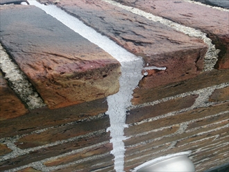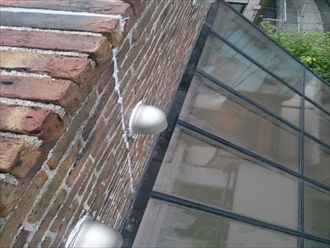 笠木部分にあたるレンガタイルです。目地にはコーキングが打って有りますが、劣化していてスポンジのようになっていました。サッシと壁の取り合い部分と、この目地からの浸入が原因と考えましたが、実際にはレンガ自体が雨水を吸いますし、詰めてある目地も隙間だらけになっているので、完全に止めるには笠木と立上り部分も塞がないと止められないでしょう。ガラス張りの屋根部分は勾配が急なので足場が必要になります。可能性のある部分をしっかりと止めて雨漏りの不安を解消しましょう。