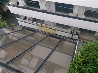 雨漏りしている屋根部分です。アルミでフレームを組んであり、ガラスが入っていて室内に明かりを取り込んでいますが、取り合い部分などから雨水が浸入して来ています。