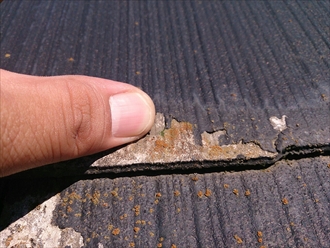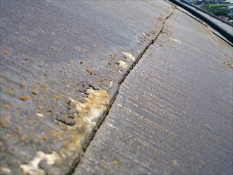 塗装をした塗膜の劣化は確かにあります。剥がれている所もあれば、めくれている所もあるのですが、気になるのはスレート自体に元々塗装されていた塗膜も剥がれていて、スレートの基盤がむき出しになっている事です。近くで見てみると、スレートが剥離しているのが分かります。これと似たような状態になるのが、アスベストを含まないノンアスベストのスレートに切り替わった頃の初期ロッド材でした。耐久性が劣るのか、剥離してしまう材料が出回った事があったのですが、年数を考えてもその製品ではありません。ですが良く似た症状です。この様な状態まで劣化が進みますと塗装工事をしても直ぐに剥がれてしまいますので、オススメ致しません。今回は、下地の野地板に全く問題が無いので、カバー工事をご提案します。