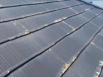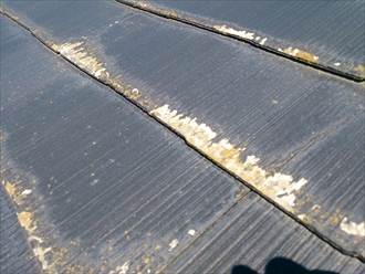 屋根はスレート葺きでした。10年以上前に塗装工事をした、という事でしたが、お客様がおっしゃる通りに全体的に白くなっていました。塗装が劣化していて色が飛んでしまい白っぽく見えているのかと思いましたが、よく見ると違いました。