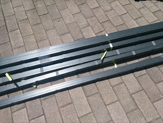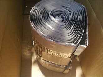 棟の取り直し工事に使用したのは、『ハイロール』と『タフモック』です。右の棒状の材料が棟の下地に使用するタフモックで、通常木材を使用する部分に樹脂製の材料を使用していますので、耐久性が高くなる材料です。左の写真のハイロールは、防水性のある材料で、漆喰の替わりになるものです。