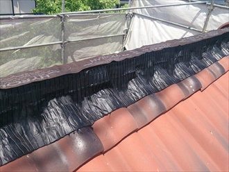 ハイロールを被せた後は、瓦の形状に合わせて密着させていきます。ジャバラ状になっているので瓦にもぴったりとフィットしますし、強力なブチルによって瓦に隙間なく密着していきます。瓦を被せると、少し黒い部分が見えます。漆喰と違ってひび割れたり剥がれたりすることが有りませんので、耐久性とメンテナンス性に優れたお薦めの材料です。