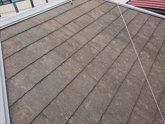 横浜市緑区で屋根の調査をおこないました。ご近所の方から屋根の棟板金が浮いていると指摘されたそうで、心配になってご連絡いただきました。屋根の状況を確認すると確かに棟板金が浮いているのがわかりました。築年数が経過してくると、棟板金の下地の貫板が痩せてしまい、板金を固定している釘が抜けてしまう事があります。釘が抜けてパカパカしてしまうと風が強い時などは隙間から風が入りこんで棟板金を浮かせてしまう事になります。棟板金が飛んでしまうと非常に危険ですので、浮いているのを見つけたら直さなければなりません。その時に確認が必要なのは、下地の貫板の状態です。痩せていたとしても屋根にしっかりと固定されていれば、釘の代わりにビスで補強する事も可能です。スレート葺きの屋根は今までに一度もメンテナンスをしたことが無さそうで、大分傷みが出ています。棟板金だけを交換するのではなく、屋根全体のメンテナンスを考える良いタイミングかもしれませんね。