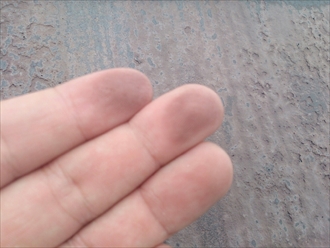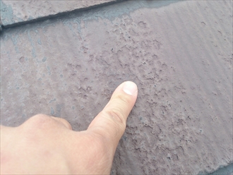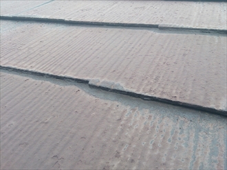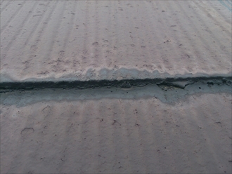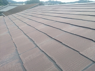 以前に塗装した塗膜が劣化してハゲかかっていました。この劣化状態は、下地処理をしっかりと行わないとガサガサな仕上がりになってしまい塗装が剥がれやすくなります。屋根全体をみましたが、野地板に傷みが出始めているので、塗装をしても雨漏りは止まりません。屋根の勾配も緩やかなのでスレートではなく金属屋根に葺替える事をお勧めします。建物に傷みが出る前に早めに対処しましょう。