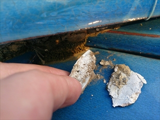 漆喰は、全体的にこんな感じです。ほとんど無くなっていてドロがむき出しです。もともとの漆喰が奥に入っていたので、ドロが流れ出すとあっという間に棟が崩れてしまうので、見ためだけではなく重要な役割をしているのが漆喰なんです。状態を見る限り、漆喰の詰め直しを早急にしないといけませんね。