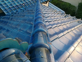 屋根は瓦葺きでズレなども無く状態は良いですね。棟瓦にズレが出始めていますね。放っておくと左右に広がっていって棟が崩れていきますので今のうちに直しておきましょう。